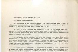 Solicitan al escritor su presencia en una reunión de Célula llamada Luis Enrique Délano, para corregir deficiencias y superar malos entendidos, y si no concurre significará que no está interesado en el trabajo partidario. Citado el 3 de abril a las 18:30 en la sede de la SECH. Firman el Secretario y la Dirección Comunal.