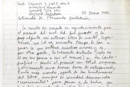 Agradece por el premio del cual Quilodrán fue jurado. Le argumenta varias razones del por qué le agradece. Le explica que reside en Inglaterra y que está realizando un posgrado en literatura inglesa.