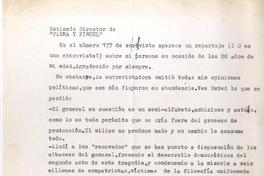 Agradece por la entrevista en ocasión de sus 80 años. Pero dice que la entrevistadora omitió todas sus opiniones políticas y además a Juan Bautista Poquelin (Moliére) le puso "Paul". Piensa que debe haber estado enferma porque no se explica semejante error.