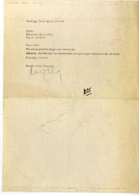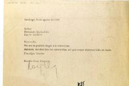 Santiago, Chile [a] Fernando Quilodrán Facsímil telefónico, 1999 agosto 16, [manuscrito] / Ramón Díaz Eterovic. 1 hoja : 27 x 21 cm. .