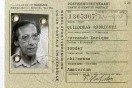 Carné de identidad y residencia N° 1365367 de Fernando Quilodrán, otorgado por la Oficina de Correos de Holanda para tramitación de servicios postales.