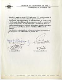 Santiago, Chile, Comunicado, 1999 diciembre 17, [manuscrito] Sociedad de Escritores de Chile.
