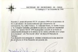 Comunican que el jurado del Premio Sech a la prensa 1999, acordó por unanímidad otorgar el premio a la "Revista de Libros" del diario El Mercurio, por sus valores culturales en el campo de la literatura. Firman el documento: Isabel Velasco, Emilio Oviedo, Edmundo Moure y Fernando Quilodrán.