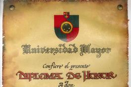 Diploma de honor otorgado a Fernando Quilodrán por la Universidad Mayor, por su trayectoria y aporte al desarrollo cultural y fomento del libro y la lectura, firmado por el Rector Rubén Covarrubias Giordano.