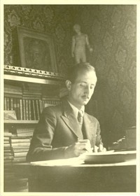 [Roque Esteban Scarpa] [fotografía]. Santiago, Chile : [Producción no identificada], [cerca de 1940]. 1 fotografía : Monocromo blanco y negro ; 8,7 x 11,6 cm. .