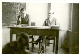 Roque Esteban Scarpa y Carlos Ruíz- Tagle en una conferencia de prensa en la Escuela de periodismo Universidad Católica.