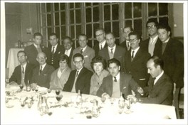 Comida en honor a Félix Martínez. Sentados de izquierda a derecha: Cedomil Goic, Roque Esteban Scarpa, Elena Martínez, Loy Vallafi, Juan Villegas, Jorge Guzmán. De pie: Mario Rodríguez, C. Acevedo, H. Schulte, Ferrecio Allende y Federico Schopf.