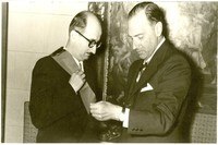 [Condecoración con la Gran Cruz Alfonso X] [fotografía]. Santiago, Chile : [Producción no identificada], 6 de octubre de 1952. 1 fotografía : Moncromo blanco y negro ; 8,5 x 14,5 cm. .