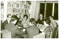 Reunión en el Centro de Investigaciones de Literatura Comparada de la Universidad de Chile. De izquierda a derecha: Ramón García Castro, Dr. Paulius Stelingis, Marta Glukman, Dr. Roque Esteban Scarpa, Jorge Muñoz (secretario), Nelly Donoso. De espalda: Antonio Bombal, Armando Uribe, también presente Carlos Morand.
