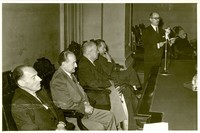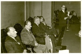 Roque Esteban Scarpa pronunciando el discurso oficial en el Homenaje a Alonso de Ercilla y Zúñiga , realizado en el Salón de Honor del Congreso Nacional de Chile. Presentes de izquierda a derecha: José María Doussinague (Embajador de España); Señor Sépulveda (Ministro de Relaciones Exteriores); General Carlos Ibañez del Campo (Presidente de la Républica), Diego Barros (Ministro de Educación), al fondo del salón el Cardenal José María Caro.
