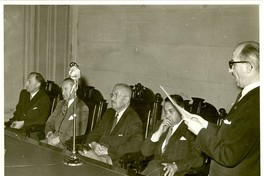 Roque Esteban Scarpa, dando inicio al Homenaje a Alonso de Ercilla y Zúñiga en el Salón de Honor del Congreso Nacional, entre los asistentes: el Presidente Carlos Ibañez del Campo, el Ministro de Relaciones Exteriores, el Ministro de Educación, Diego Barros Ortíz y el Embajador de España José María Doussinague.