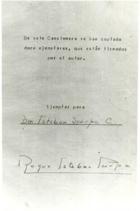 Fotografía de una página del "Cancionero de Hammud" (Dulce sombra de estío"), con el autógrafo de Roque Scarpa dedicado a su padre Esteban Scarpa.