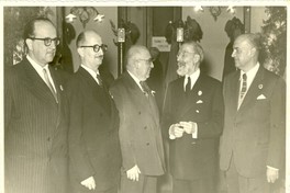 Materias: Lira Urquieta, Pedro - Souviron, José María - Menéndez Pidal, Ramón - Congreso de Academias de la Lengua Española - Madrid, España - Fotografías - Scarpa, Roque Esteban - Autores chilenos - Autores españoles - Silva Castro, Raúl