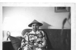 Rosamel del Valle, vestido con un kimono y un sombrero Kasa.