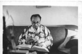 Rosamel del Valle buscando palabras en un diccionario, vestido con un kimono.