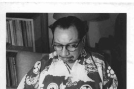 Rosamel del Valle buscando palabras en un diccionario, vestido con un kimono.