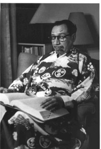 Rosamel del Valle buscando palabras en un diccionario, vestido con un kimono.
