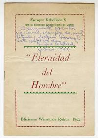 Dedicatoria a Joaquín Edwards Bello escrita en la portada del impreso "La eternidad del hombre" (Ediciones Winett de Rokha 1962).
