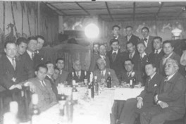 Augusto d'Halmar en un almuerzo [Fotografía]. [Santiago, Chile] : [Producción no identificada], 1948. 1 fotografía : Monocromo blanco y negro, 14 x 8,8 cm. .
