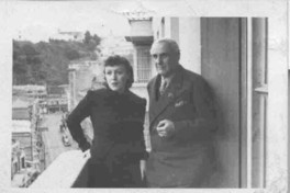 Augusto d'Halmar junto a una mujer observando desde un balcón en un departamento.