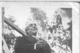 Augusto d'Halmar en casa de amigos. [Fotografía]. [Santiago, Chile] : [Producción no identificada], 1946. 1 fotografía : Monocromo blanco y negro, 6 x 9 cm. .
