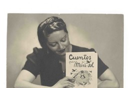 Marta Brunet mostrando la tapa del libro "Cuentos para Mari-sol"