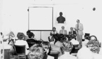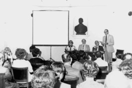 Conferencia en la Biblioteca Nacional [fotografía]. Santiago, Chile : Producción no identificada], cerca de 1980. 1 fotografía : Monocromo Blanco y Negro 11,5 x 17,5 cm. .