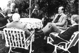 Enrique Campos Menéndez junto a Alfonso Calderón y Roque Esteban Scarpa, entre otros, conversando en la terraza de un jardín.