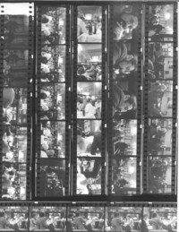 Fotografía de una prueba de contacto de negativos donde aparece Rolando Cárdenas con amigos en el Café Torres.
