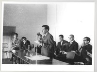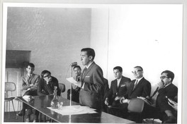 Rolando Cárdenas leyendo, entre los asistentes se encuentran Braulio Arenas, Ronnie Muñoz, Luis Sánchez Latorre y Antonio Skarmeta entre otros.