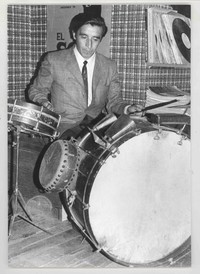 Rolando Cardenas tocando bateria en la casa de Enrique Moletto.