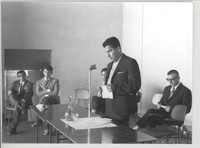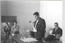 Rolando Cárdenas observa junto a Óscar Hahn y Braulio Arenas, mientras Ronnie Muñoz está leyendo en una reunión de escritores en La Serena.