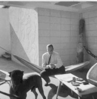 Camilo José Cela en su casa, a un costado se ve un mural de Picasso y en primer plano su perro Babette.