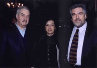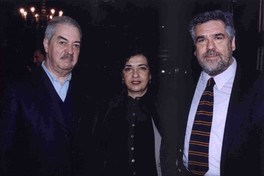 El escritor Carlos Cerda con Miguel Varas y Faride Zerán en un acto de inaguracion, en Sala Ercilla de la Biblioteca Nacional de Chile.