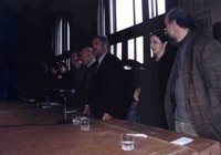 El escritor Carlos Cerda junto a Jorge Edwards, Raúl Zurita, Ana María del Río entre otros, en la Sala Ercilla de la Biblioteca Nacional de Chile.