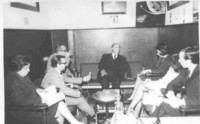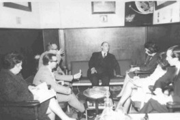 Conferencia de prensa [Fotografía]. [Santiago, Chile] : [Producción no identificada], 1965. 1 fotografía : Monocromo blanco y negro, papel mate ; 12 x 18 cm. .