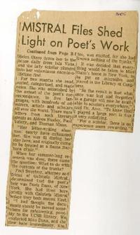 Letters of Gabriela Mistral. A Literary Treasure Is Discovered Here ; Mistral Files Shed Light on Poet's Work (Santa Barbara News-Press, Nov. 14, 1965) -- Mistral Literary Heir Leaves on Chile Study (Santa Barbara News-Press, Nov. 19, 1965) -- Charlas : Magda Arce sobre Gabriela Mistral ("El Sur", Concepción 1° de jul. de 1975) -- La verdadera historia (La Tercera, Domingo 26 de dic. de 1982) / Roque Esteban Scarpa.