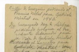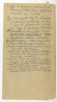 Anotaciones referentes a la solicitud de autorizaciones para que Gabriela Mistral ocupe el el cargo de Cónsul en Lisboa, y también peticiones de apoyo para otorgarle el Premio Nobel en 1946.