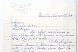 Chile [a] Magda Arce carta, 1987, [manuscrito] Isolina Barraza de Estay.