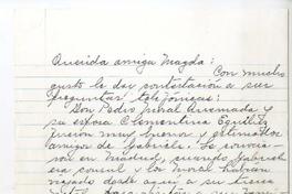 La remitente responde a unas preguntas de Magda Arce, sobre Don Pedro Moral Quemada y su Sra. Clementina Eguiluz, quienes con una donación de libros de Gabriela Mistral, su amiga, crearon una Bilblioteca en Vicuña con su nombre. También fueron los que la hospedaron cuando visitó Vicuña en 1938.