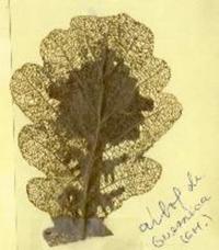 Hoja procedente de árbol de Guernica con una nota referente a ella.