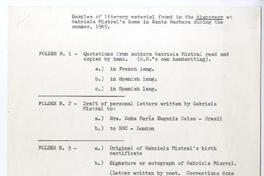 Samples of literary material found in the discovery at Gabriela Mistral's home in Santa Barbara during the summer, 1965 [manuscrito] Magda Arce.