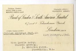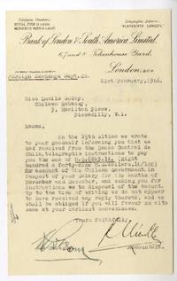 London, [Inglaterra] [a] Miss Lucila Godoy, Chilean Embassy, Piccadilly, W.I. , [Inglaterra]. carta, 1946, [manuscrito] / Bank of London & South America Limited. 1 hoja ; 20 cm. .