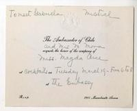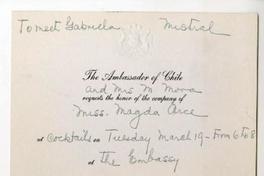 Tarjeta de invitación a un cocktail en la Embajada de Chile, para conocer a Gabriela Mistral.