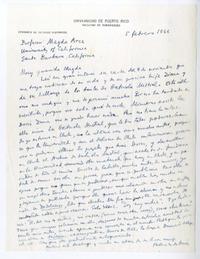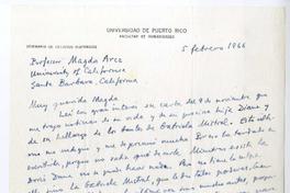 Rio Piedras, Puerto Rico [a] Magda Arce, University of California, Santa Barbara, California. carta, 1966, [manuscrito] Federico de Onis.