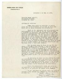 El remitente contesta carta de Magda Arce del 22 de noviembre. Lamenta que no aceptara el trabajo que le habían ofrecido en la Embajada de Chile en Washington.