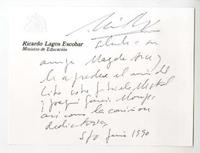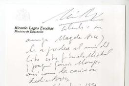 Tarjeta con escudo chileno y membrete de "Ricardo Lagos Escobar. Ministro de Educación".
