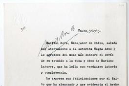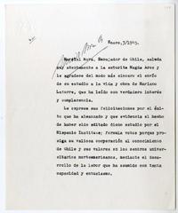 El Embajador de Chile agradece a Magda Arce por el envío de su estudio sobre la vida y obra de Mariano Latorre.