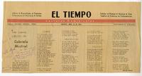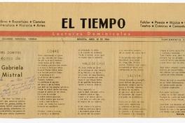 Lecturas dominicales : Tres poemas inéditos de Gabriela Mistral [artículo] / El Tiempo (Bogotá, Colombia) 10 abril, 1966 1 hoja ; 20 x 38 cm. .