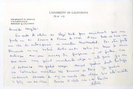 University of California, Department of Spanish and Portuguese, California[a] Magda Arce, Santiago, Chile. Carta, 1959 noviembre 13, [manuscrito] / Arturo Torres Rioseco. 1 hoja ; 14 x 22 cm. 1 sobre (9 x 16 cm.) .